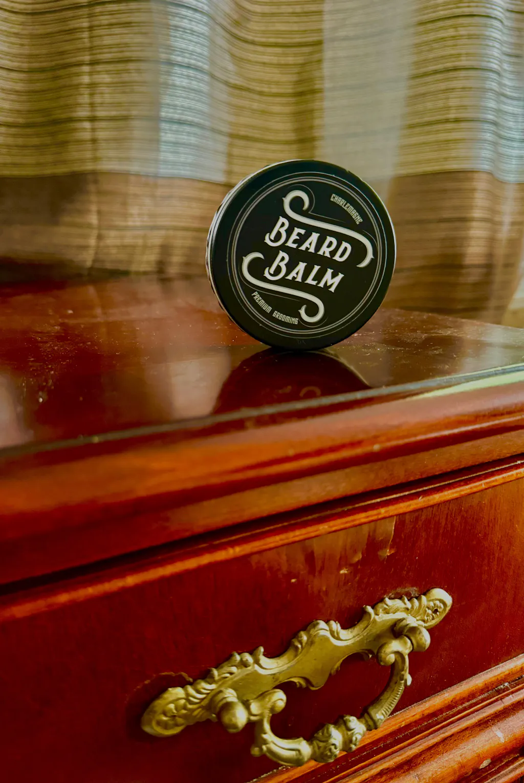 Charlemagne Beard Balm tin with signature “Leather” scent, natural ingredients for soothing skin and relieving itch.